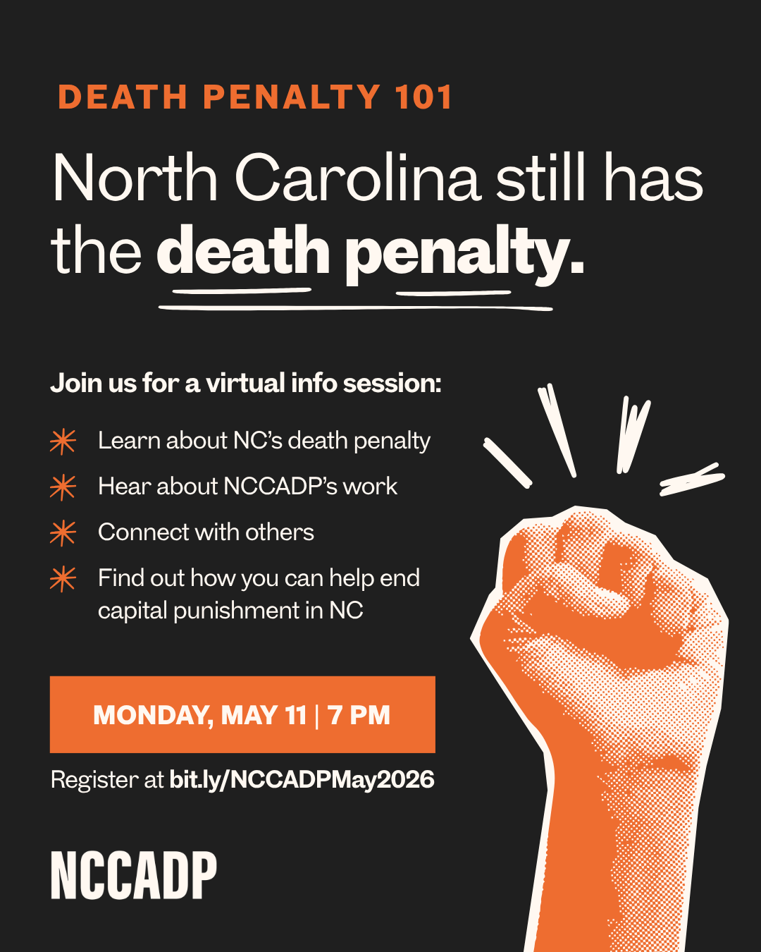 Join us for a virtual info session to learn about the state of the death penalty in North Carolina, the work of NCCADP, and how you can get involved. This hour-long conversation is a chance to connect with others across the state and find your place in the movement to end capital punishment.