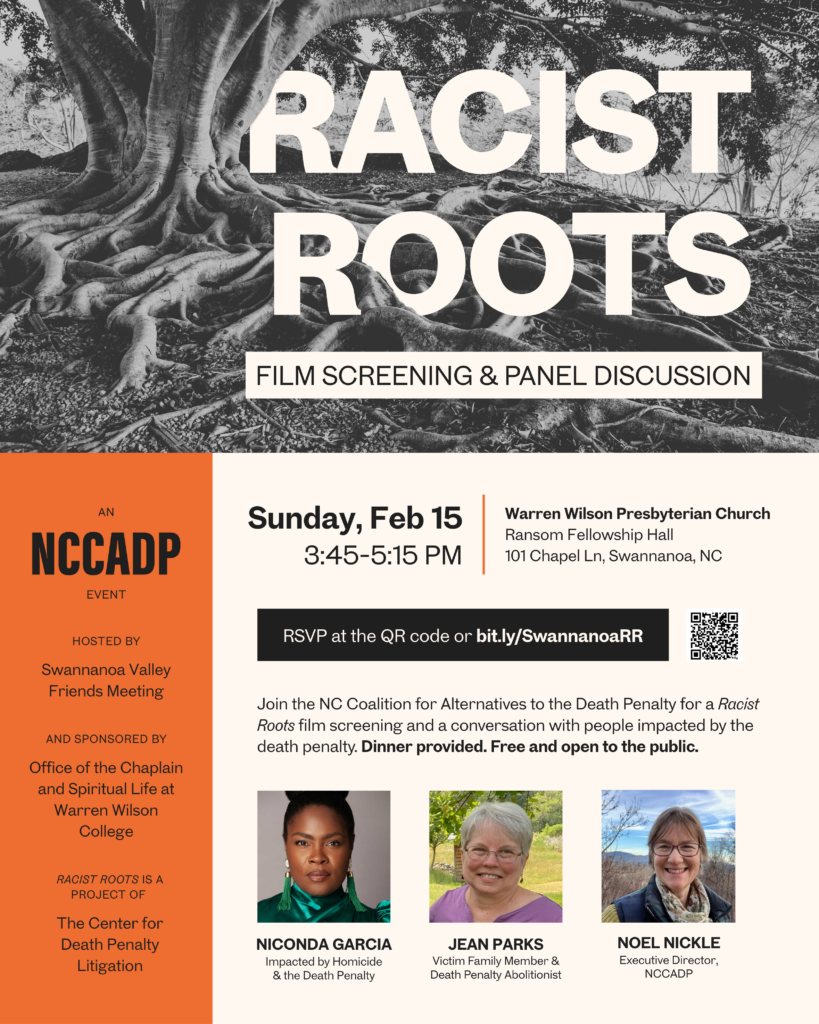 This event is presented by the North Carolina Coalition for Alternatives to the Death Penalty in partnership with Appalachian State Master of Social Work students and the Criminal Justice Club. Racist Roots is a project of the Center for Death Penalty Litigation.