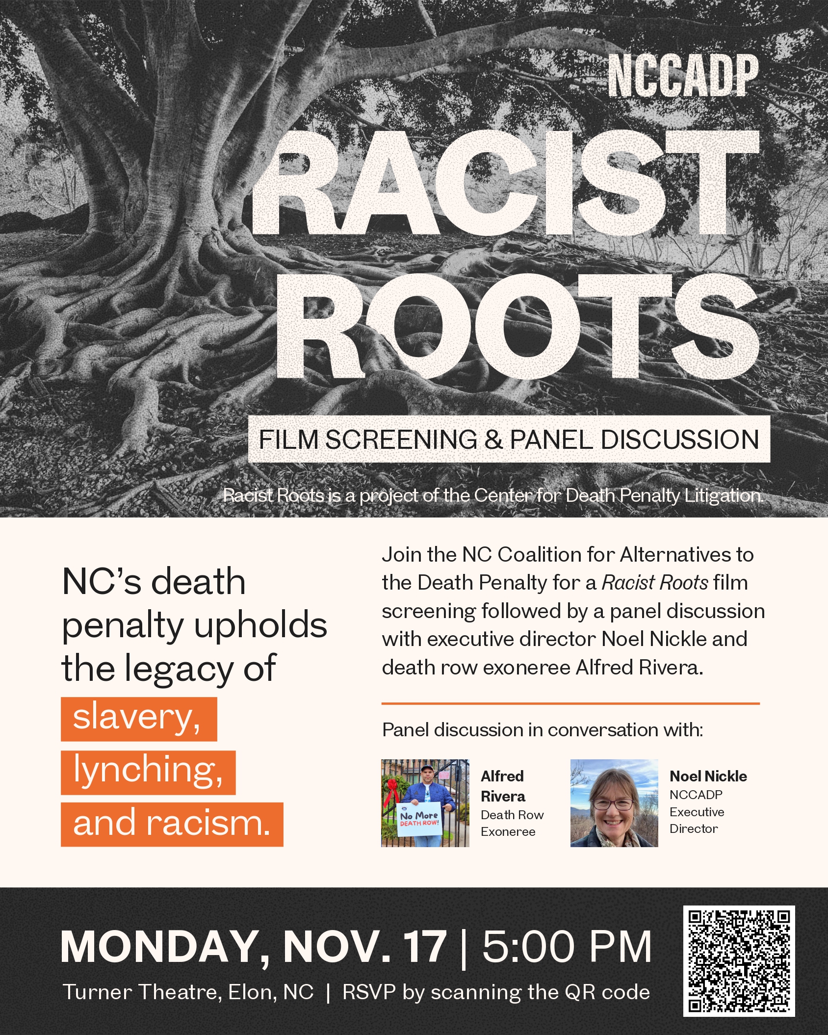 You’re warmly invited to join NCCADP for a screening of Racist Roots, a 25-minute film that uncovers the deep entanglement between white supremacy, racial terror lynching, and North Carolina’s death penalty. Following the film, hear from Noel Nickle, NCCADP’s Executive Director, and Alfred Rivera, an exoneree from North Carolina’s death row.
