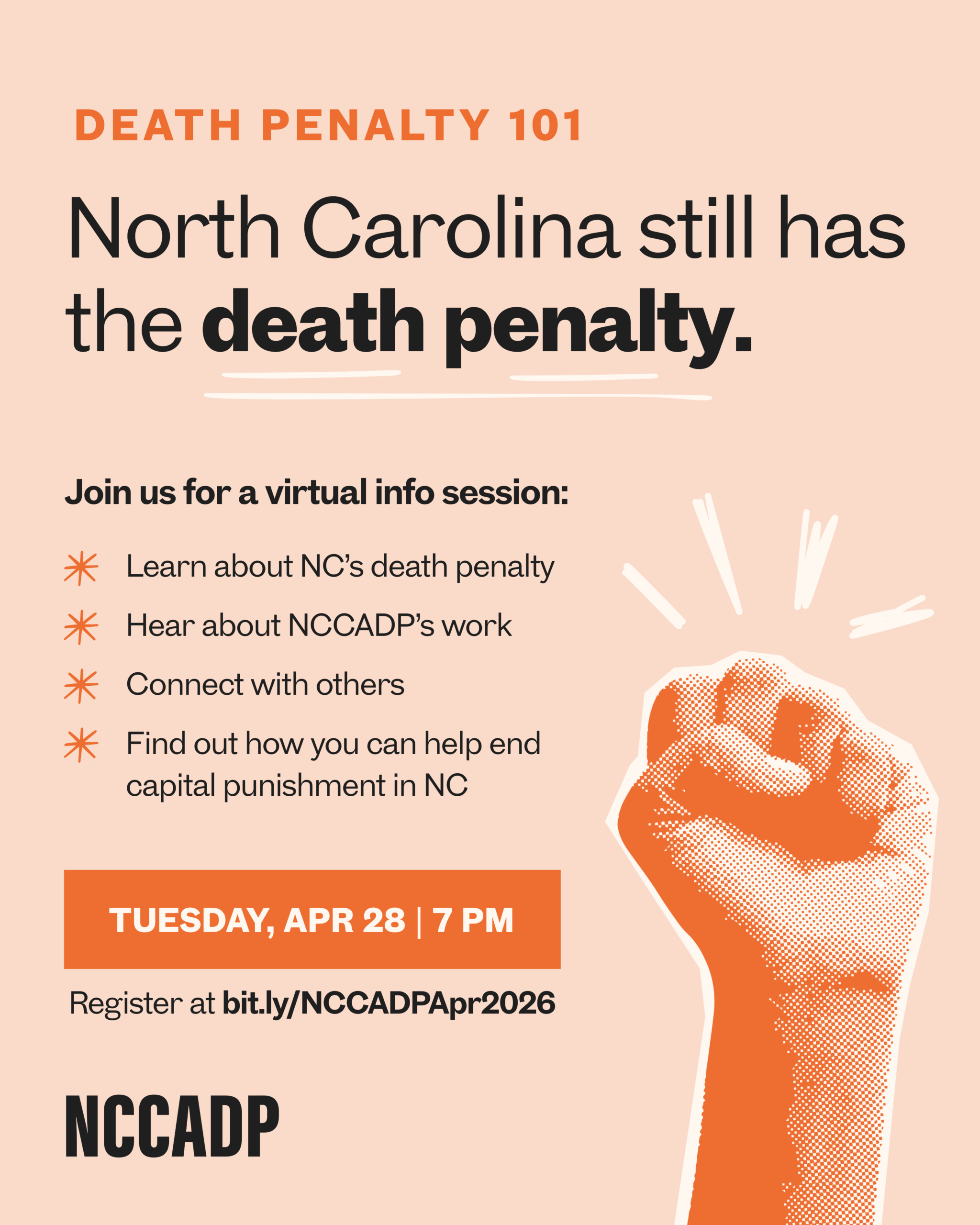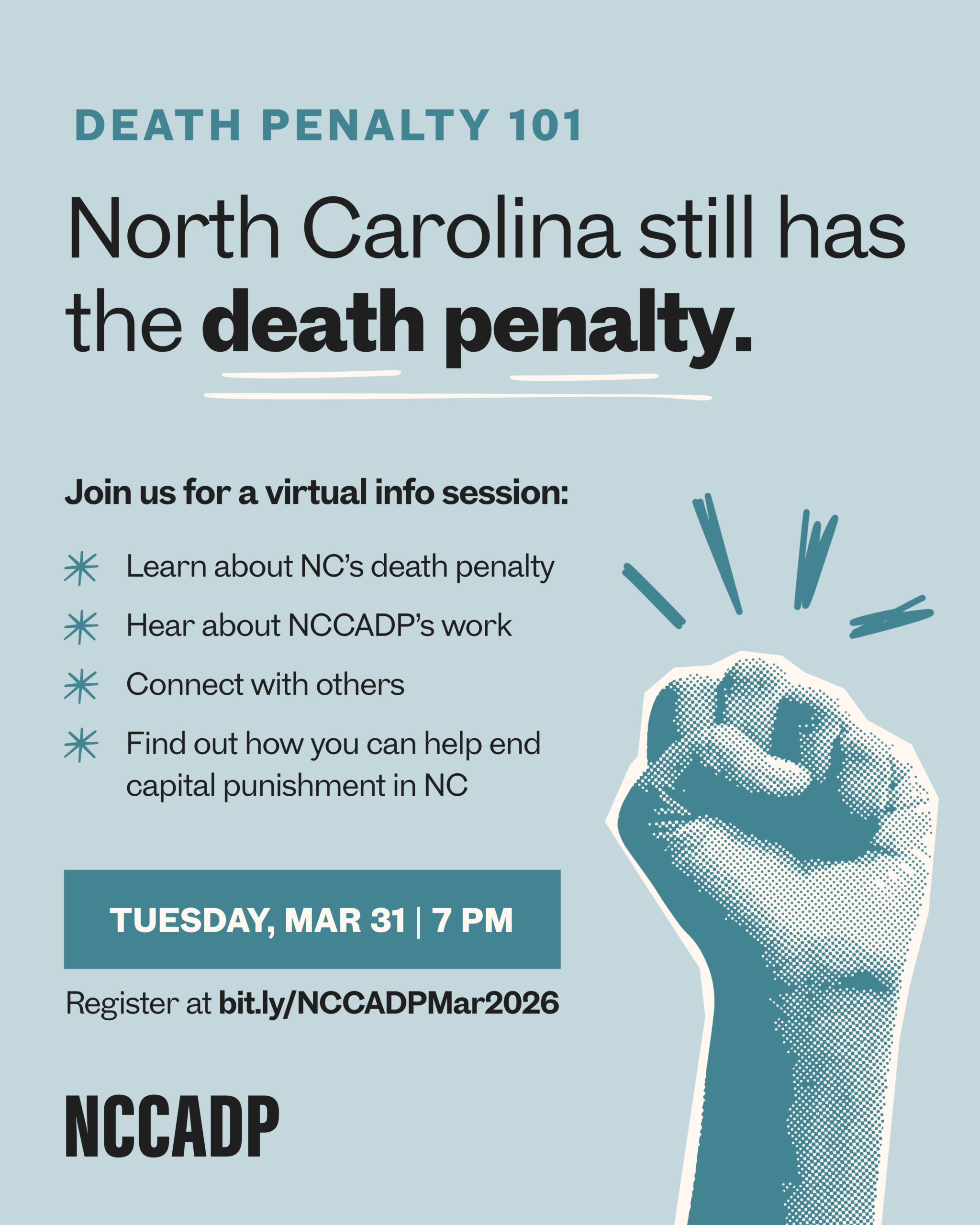 Join us for a virtual info session to learn about the state of the death penalty in North Carolina, the work of NCCADP, and how you can get involved. This hour-long conversation is a chance to connect with others across the state and find your place in the movement to end capital punishment. For security […]