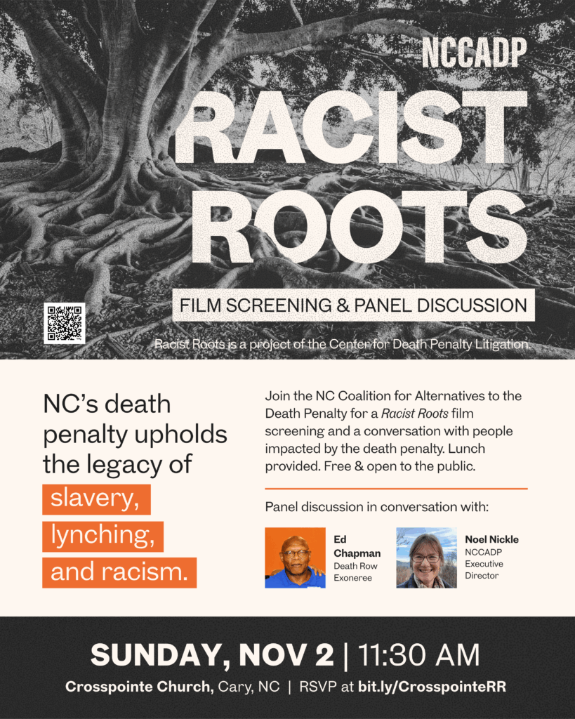You are warmly invited to join NCCADP for a screening of Racist Roots, a 25-minute film that uncovers the deep entanglement between white supremacy, racial terror lynching, and North Carolina’s death […]